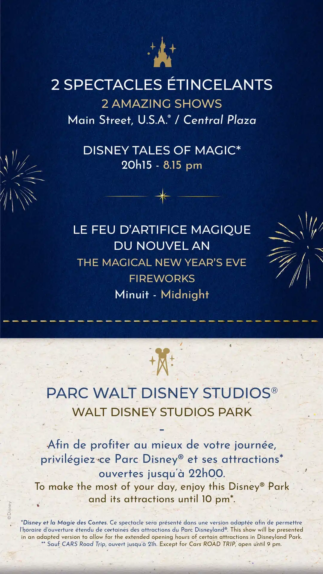 Jusqu’à 2022, la soirée du Nouvel An était une soirée payante qui nécessitait un billet à part pour les visiteurs présents ce jour-là. A cette occasion, le parc fermait plus tôt ( 18h30 ) et les visiteurs munis de billets pour la soirée pouvaient ainsi profiter du parc dès la fin de l’après-midi. Plus d’infos sur les horaires de Disneyland Paris. La soirée du Nouvel An 2025 est donc GRATUITE pour tous les visiteurs présents sur le parc ce jour là ( et muni d’un billet parc daté ).