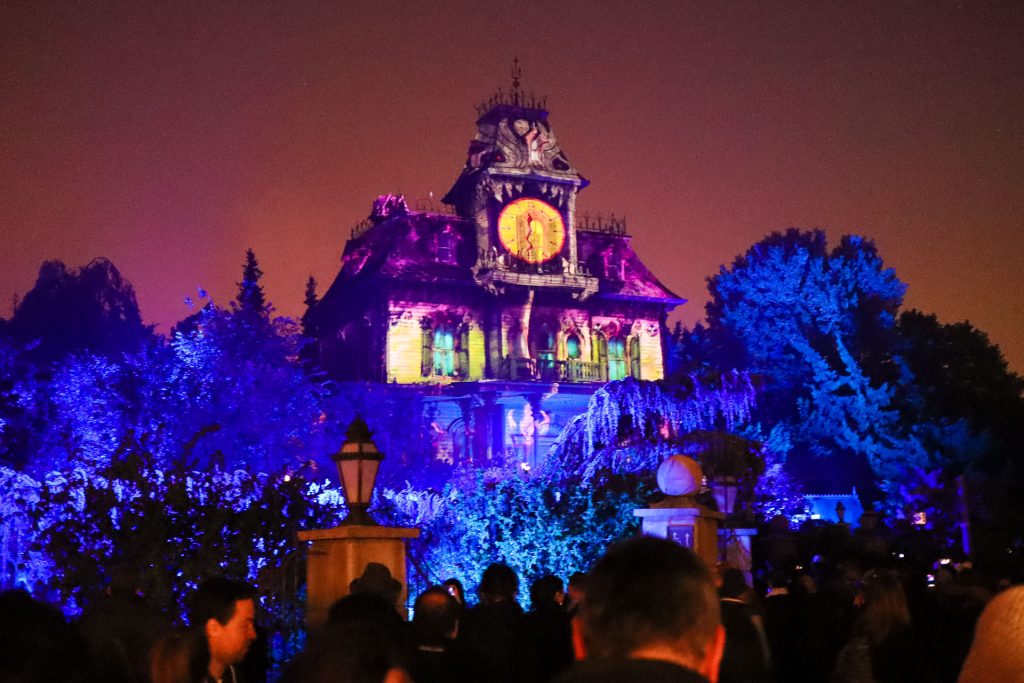 A minuit, Phantom Manor fut le temps d’un spectacle, le support d’un mapping de toute beauté que j’espère vraiment revoir pour Halloween cet automne ! De même pour la mise en lumière verte et bleue dans les jardins du Manor où circulaient d’ailleurs une mariée à ce qu’on dit …