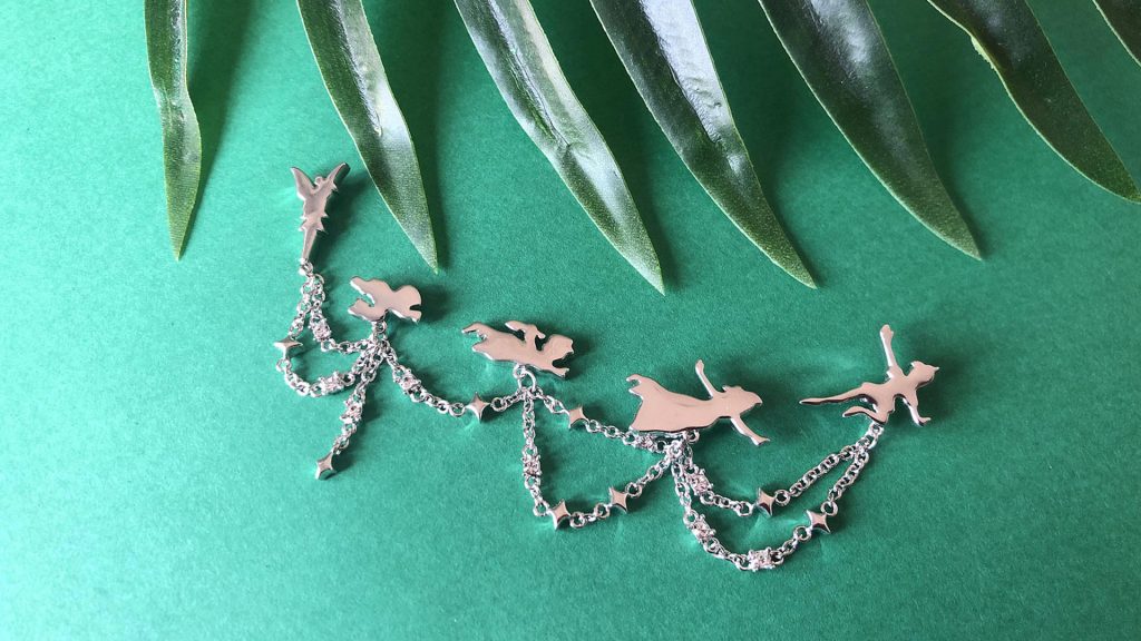 La collection de bijoux Clochette est en plaqué argent et traitée contre les allergies. La collection se compose d’une paire de boucles d’oreille, d’un jonc, d’un bracelet, d’une broche et d’un collier. Jugez plutôt :