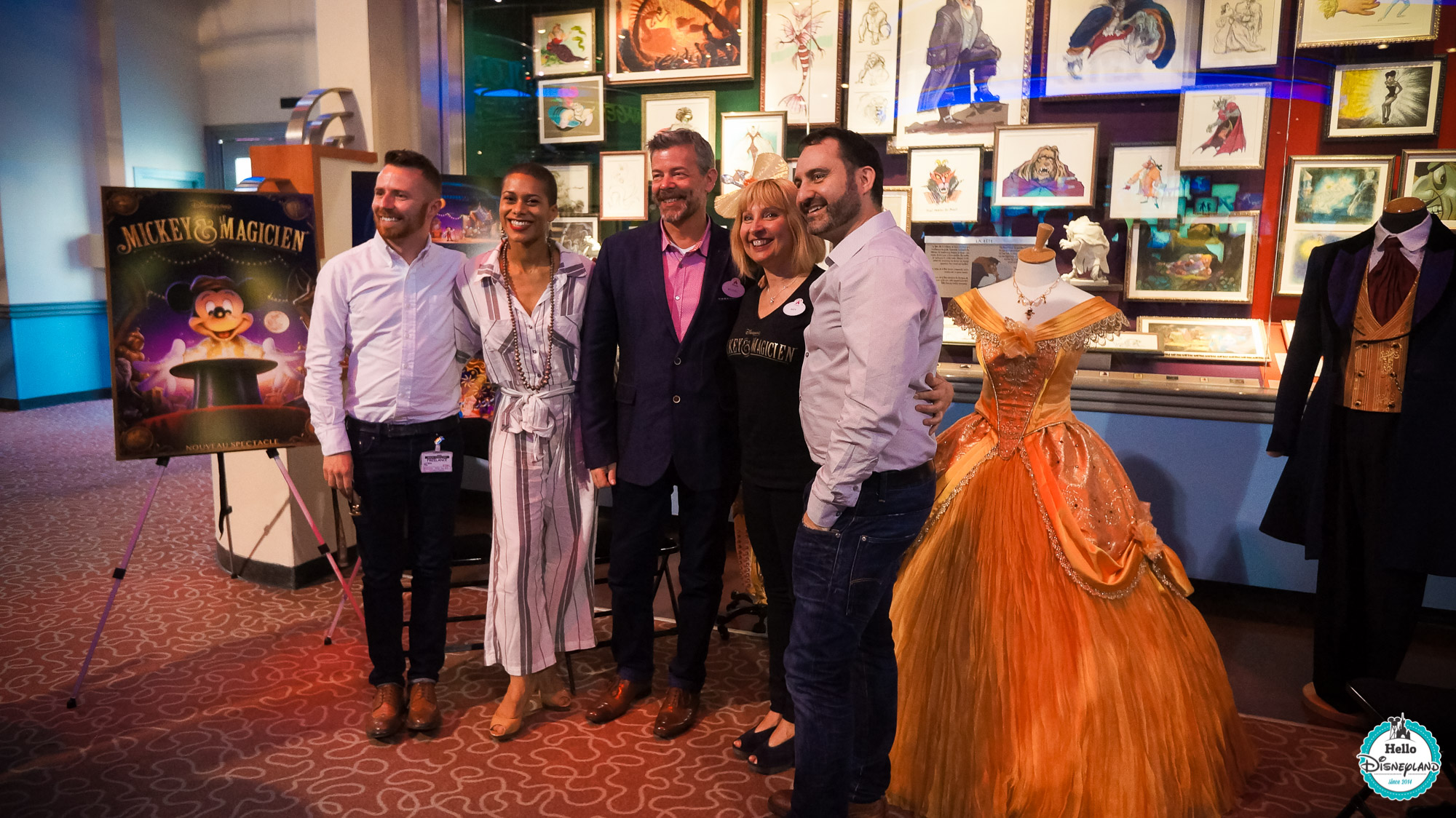 18h sonne, l’entretien avec les créateurs du spectacle approche. L’entretien aura lieu au postshow de The Art of Animation, face à l’Animagique Theater. La table ronde se fera en anglais, ce qui promet d’être costaud pour suivre et bien tout comprendre. Dans la salle, des concept arts du spectacles et croquis des costumes entourent l’endroit où les créateurs s’assiéront. Il y a également la robe de Belle, le costume du Magicien et un costume de danseuse du tableau de La Belle est la Bête. Nous nous installons, et l’équipe du spectacle arrive. Face à nous se trouvent :