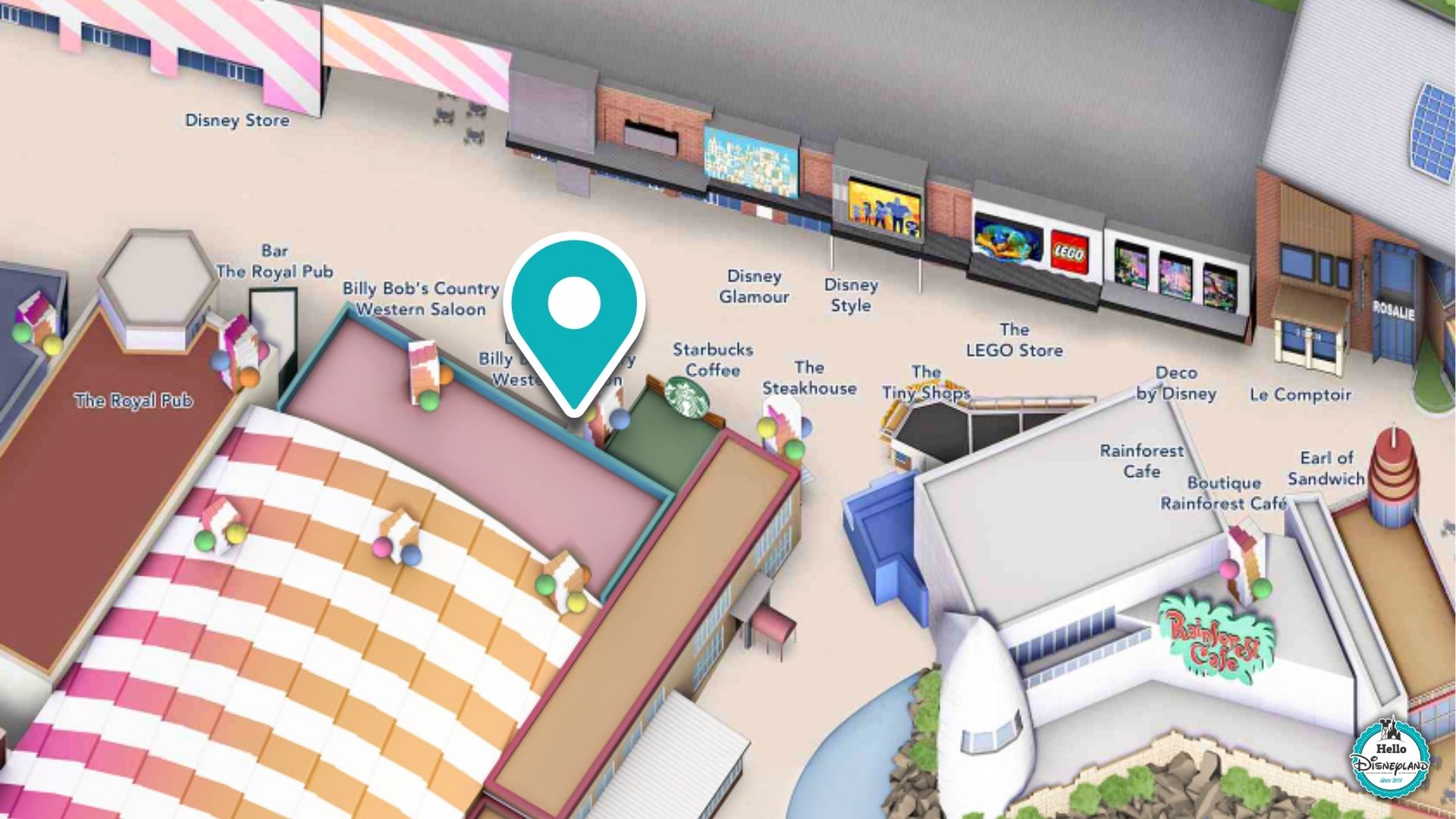 Le buffet Billy Bob’s Buffet est situé au Disney Village, au rez de chaussée, entre le Starbucks et le bar Billy Bob’s :