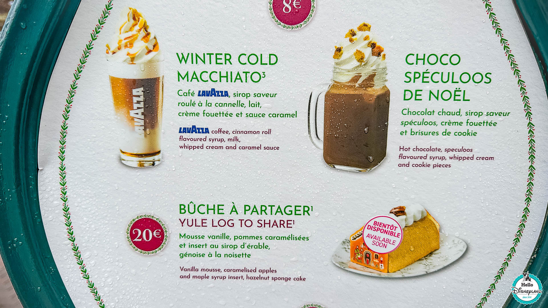 Disneyland Paris dévoilera bientôt la pâtisserie à partager de cette année, mais l’an dernier c’était une bûche de Noël qui était proposée avec des Cold Brew ( café glacé ) aux saveurs d’hiver :