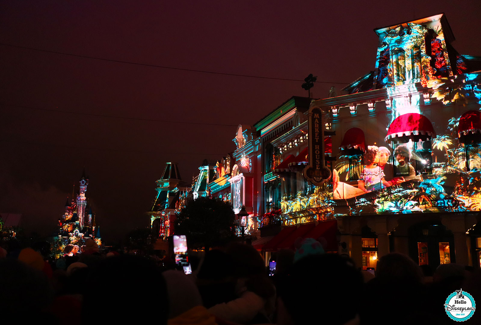 En revanche, distance oblige, vous verrez très peu ou très mal les projections sur le Château, en particulier pendant les saisons d’Halloween et de Noël ou la rue est décorée de guirlandes traversantes qui obstruent la vue sur celui-ci.