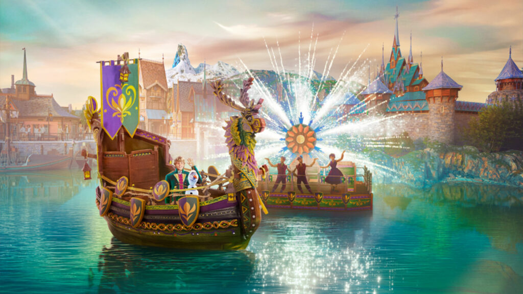 Ce spectacle mettra en scène 3 drakkars inédit sur lesquels les visiteurs pourront voir Olaf, Kristoff Anne et Elsa ainsi que les villageois d’Arendelle ! Ces drakkars créés en France par Couach Navigation sont plein de détails et de symboles des films ! Des merveilles visuelles !
