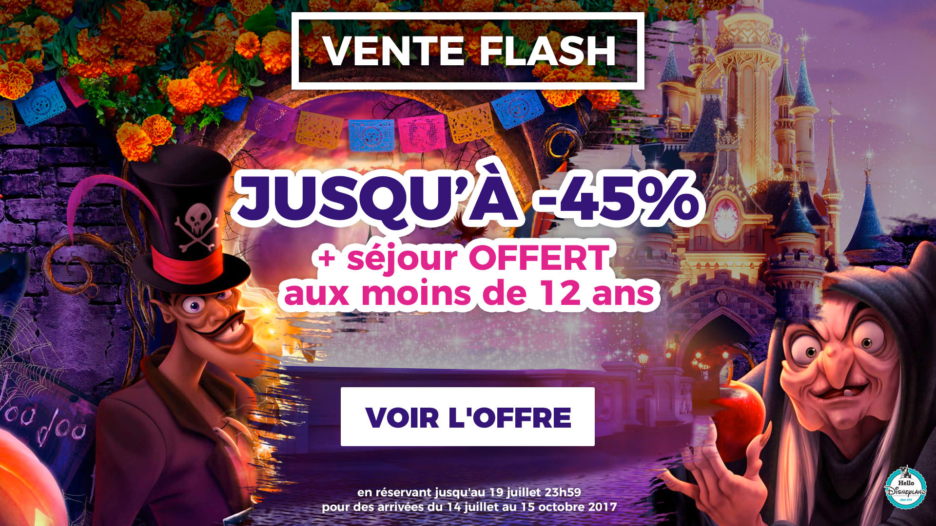 Nouvelle VENTE FLASH Disneyland Paris ! On se dépêche, cela ne dure que quelques jours ! Cette fois-ci, l’offre magique concerne vos séjours avec des arrivées entre le 14 juillet et le 15 octobre 2017. Que vous choisissiez de profiter de l’été à Disneyland Paris, de souffler après la rentrée ou de venir découvrir une saison d’Halloween haute en couleurs et riche en citrouilles, cette vente flash est faite pour vous ! Et vous avez jusqu’au 19 juillet 23h59 pour en profiter.