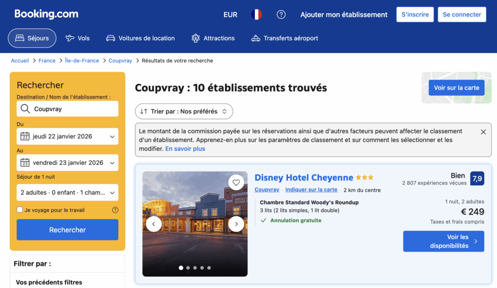 Vous pouvez aussi réserver une nuit seule à l’hôtel Cheyenne de Disneyland Paris ( sans billets parcs ) sur Booking.com ( annulation gratuite, pas d’acompte requis ) si vous disposez déjà de billets datés ou d’un Disneyland Pass ( ex Pass Annuel ) en cours de validité.