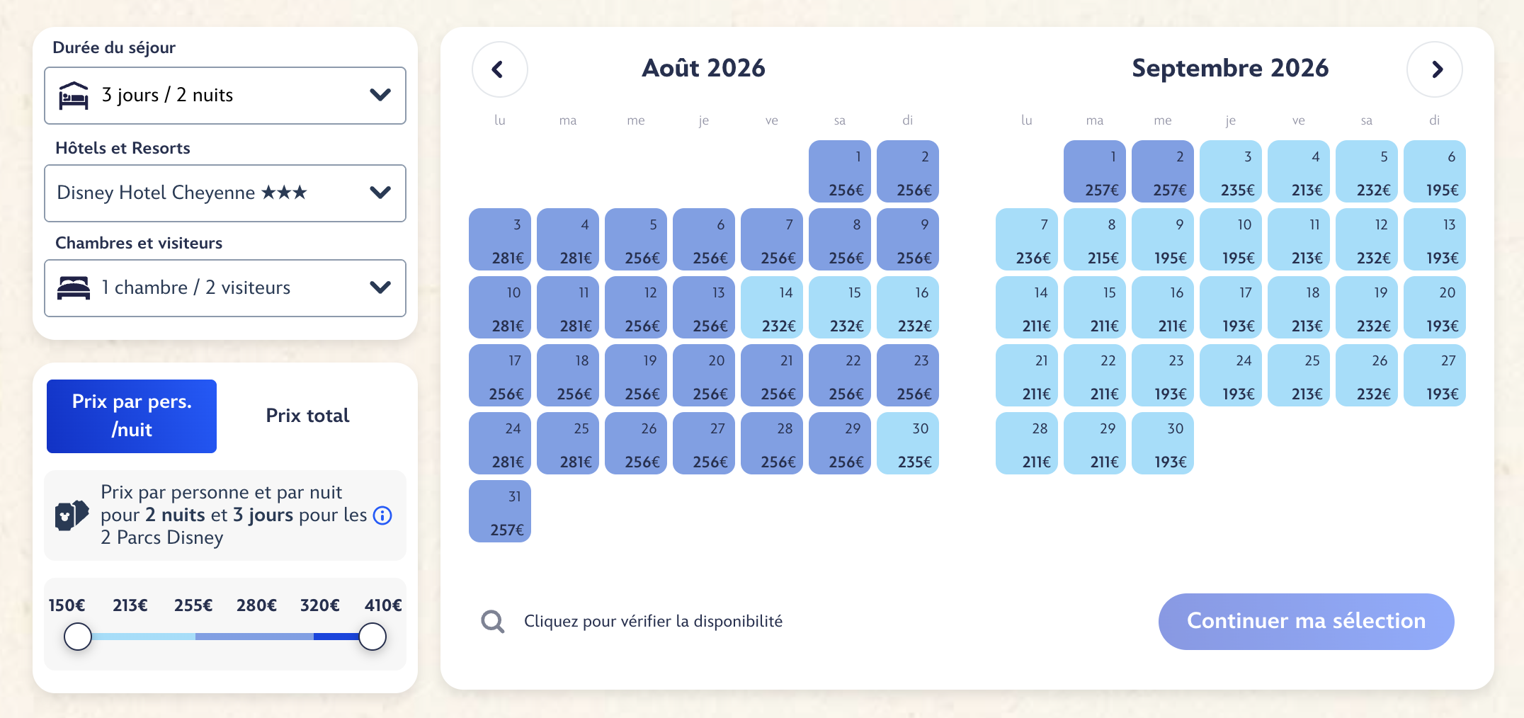 Découvrez les prix pour l’hôtel sélectionné + les prix des autres hôtels Disney de la même catégorie ou approchante puis cliquez sur « Sélectionner »