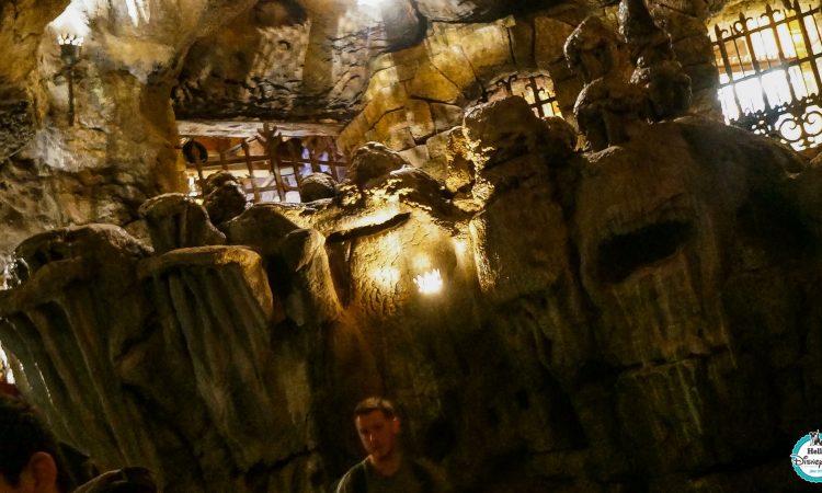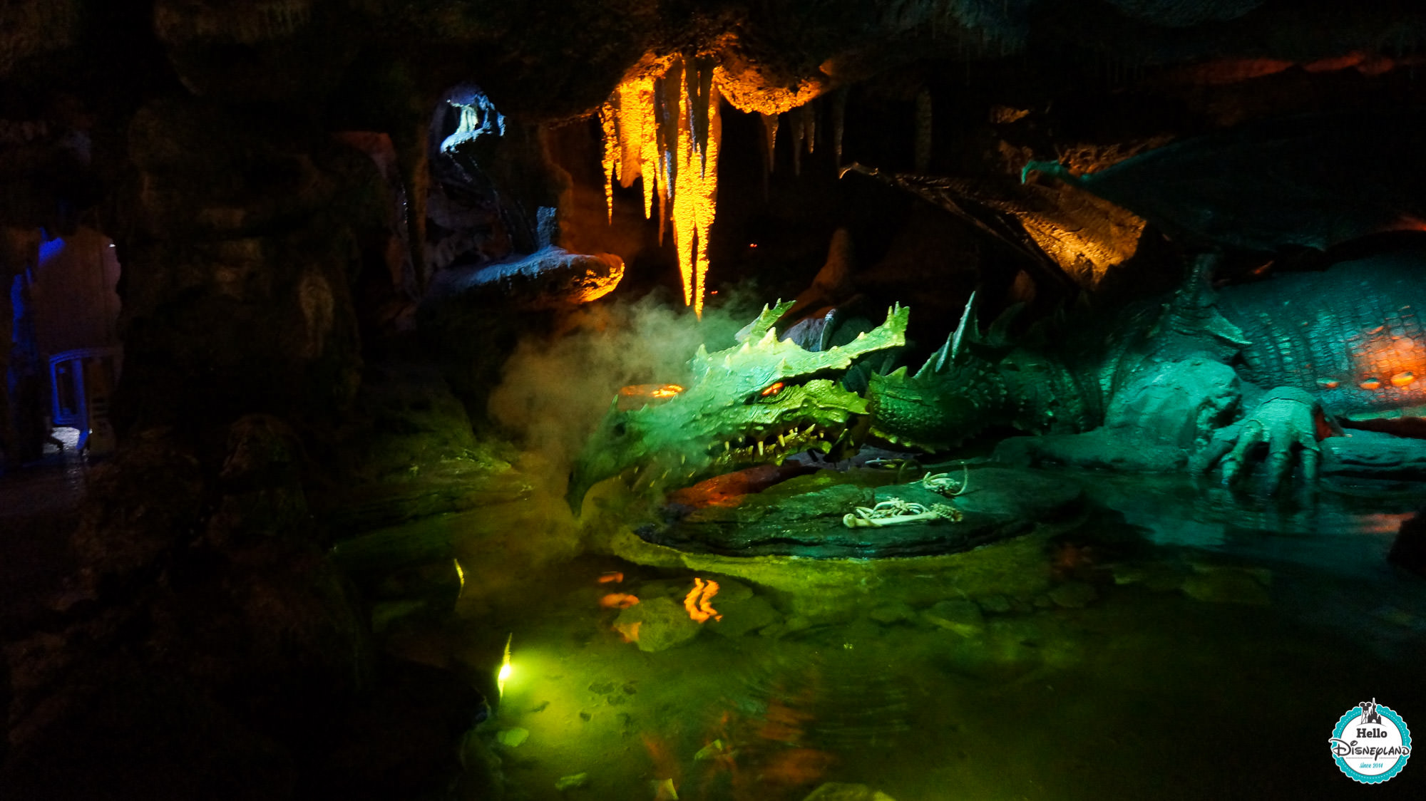 L’entrée se fait par le côté gauche du Château depuis Central Plaza ou parfois, lorsque le passage est ouvert, depuis la boutique Merlin l’Enchanteur elle même située dans le Château de la Belle au Bois Dormant. On peut aussi y accéder depuis un chemin longeant le Château depuis le Puits de Blanche Neige côté droit en direction de Fantasyland. La caverne est sombre et un peu humide. Puis au centre de celle-ci, vous apercevrez le dragon endormi. Prenez gare à ne pas le réveiller car ses ronflements sonores sont trompeurs, il se réveille facilement et n’est pas très content ! Attention, les plus jeunes visiteurs pourraient être effrayés par ce dragon très réaliste.