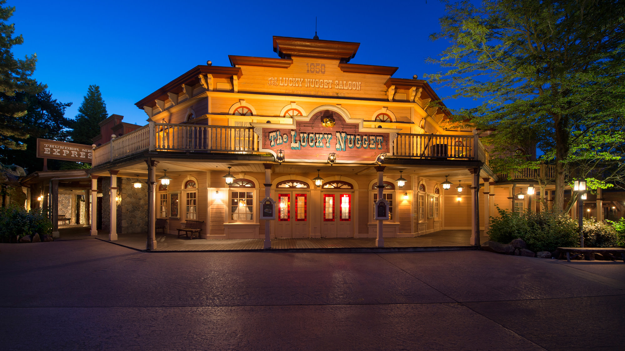 A cette époque, le saloon n’était qu’un bar où boissons et en-cas étaient servis pendant le spectacle. Puis il est devenu un restaurant service à table, et fut pendant quelques années, un buffet à volonté où les visiteurs pouvaient rencontrer des personnages. Désormais, The Lucky Nugget Saloon est un restaurant mi-fast food, mi-service à table où les visiteurs peuvent déjeuner et se régaler de ribs, de burgers et de plats saisonnier en fin d’année !