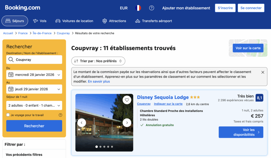 Vous pouvez aussi réserver une nuit seule à l’hôtel Sequoia Lodge de Disneyland Paris ( sans billets parcs ) sur Booking.com ( annulation gratuite, pas d’acompte requis ) si vous disposez déjà de billets datés ou d’un Disneyland Pass ( ex Pass Annuel ) en cours de validité.