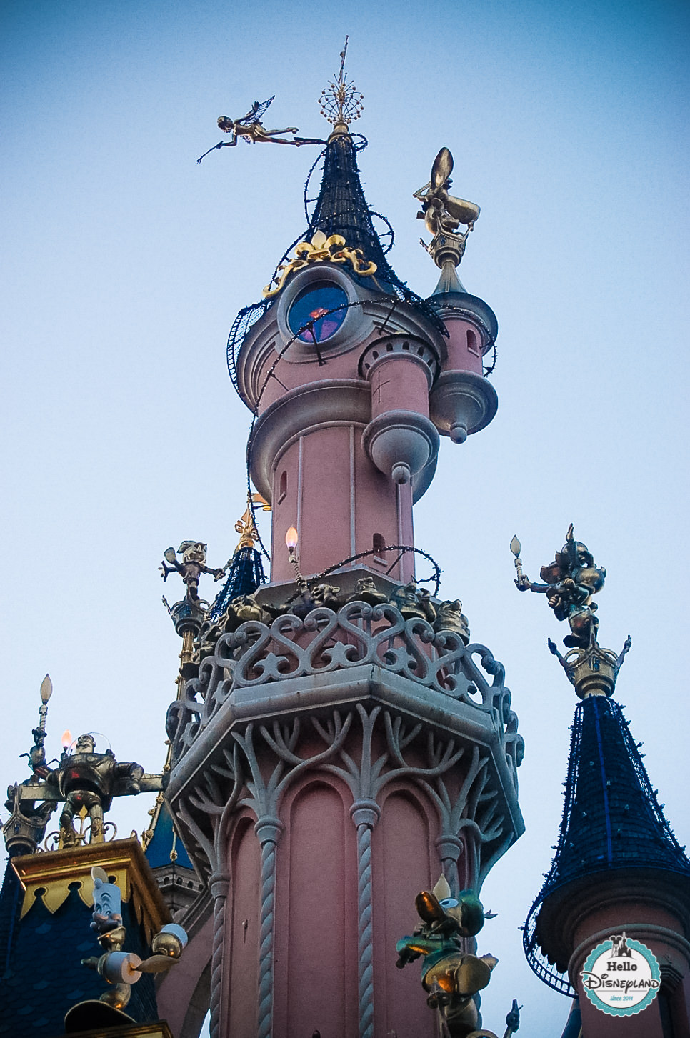 La château de la Belle au Bois Dormant était définitivement mon favori en cette saison anniversaire. Je me souviens découvrir les décorations quotidiennement sur le feu DLRP.fr, et j’adorais ces 15 petits personnages dorés qui remplaçaient les flèches des tours, portant les bougies qui s’illuminaient alors la nuit tombée lors de la Bougillumination.