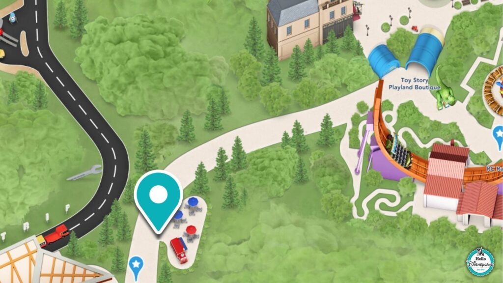 Le camion de Laugh n Go est situé aux abords de l’attraction Cars Road Trip à Worlds of Pixar, Parc Walt Disney Studios :